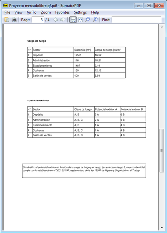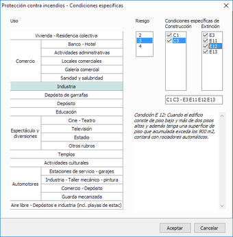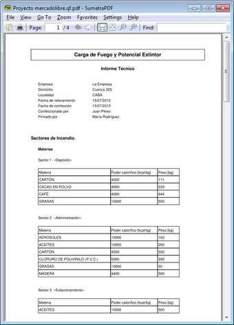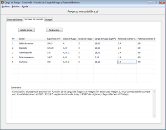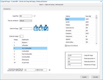 Permite cargar los datos de los distintos sectores: Superficie, Clase de fuego (A, B, C), tipo de materias que se almacenan y el Grado de riesgo del sector; con ellos calcula automáticamente la Carga de Fuego correspondiente, los Potenciales Extintores A y B, y la mínima resistencia al fuego admisible de los elementos constructivos y estructurales.